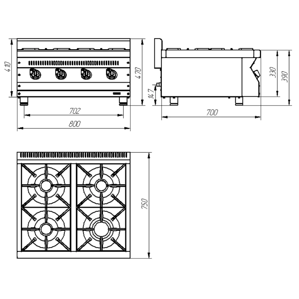 Газовая плита четырехгорелочная настольная Абат ПГК-47Н — мощное решение для профессиональных кухонь, предназначенное для приготовления и разогрева блюд из мяса, рыбы и полуфабрикатов в наплитной посуде.