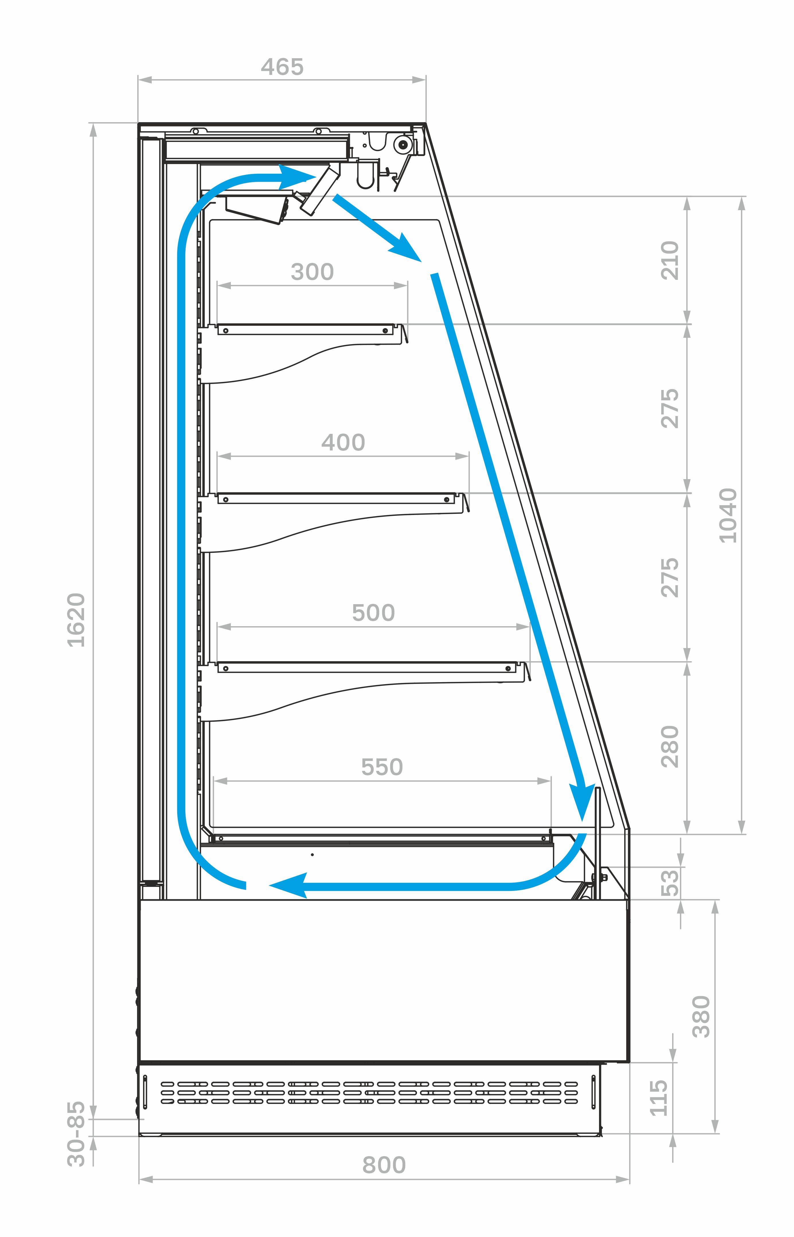 • Глубина выкладки: навесные полки: 300 / 400 / 500 мм, донная полка: 550 мм.