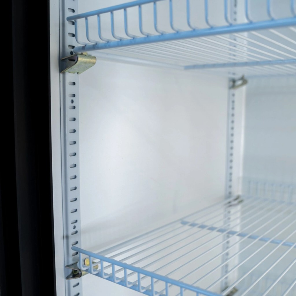 Шкаф сочетает высокую теплоизоляцию, эффективное динамическое охлаждение и долговечные материалы. Раздвижные стеклянные двери купе обеспечивают лёгкий обзор товаров и экономию пространства. Светодиодная подсветка внутреннего объёма гарантирует яркое освещение и комфортную работу персонала.