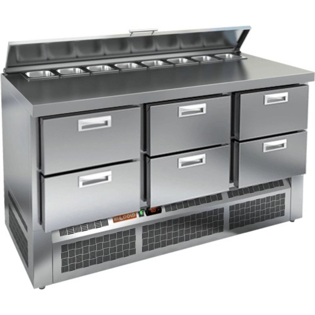 Стол холодильный для салатов HiCold SLE2-222SN (1/6) О с крышкой — это профессиональный салатный стол, предназначенный для использования в кафе, ресторанах, пиццериях и других предприятиях общественного питания. Он совмещает в себе просторную рабочую поверхность и охлаждаемый объем, обеспечивая удобство и эффективность при приготовлении различных блюд — от салатов до пиццы.