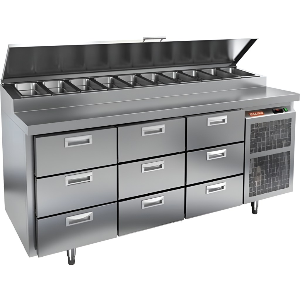 Каталог оборудования Холодильное оборудованиеСтолы охлаждаемыеСтолы холодильные для пиццыСтол холодильный для пиццы HiCold PZ1-333GN (1/3H) Стол холодильный для пиццы HiCold PZ1-333GN (1/3H) Код товара: 064-712 Поделиться: WhatsAppTelegram СравнитьДобавить в КПВ избранное 0 352 071 ₽ В корзину 0 шт Под заказСамовывоз сегодня бесплатно Взять в кредит Купить в лизинг Получить консультацию в WhatsApp Описание Характеристики Отзывы 0 Стол холодильный для пиццы HiCold PZ1-333GN (1/3H) — профессиональное оборудование для предприятий общественного питания и торговли. Он сочетает рабочую поверхность для раскатки теста и подготовки ингредиентов с охлаждаемым блоком для кратковременного хранения скоропортящихся продуктов и напитков. Такое решение обеспечивает максимальное удобство — все необходимые компоненты всегда находятся под рукой. Корпус и столешница выполнены из нержавеющей стали, что гарантирует долговечность, устойчивость к повреждениям и лёгкость ухода. Основные особенности: Нержавеющая столешница и корпус — прочность, гигиеничность и лёгкость очистки Динамическая система охлаждения — равномерное распределение холода Автоматическая оттайка — стабильная работа без образования наледи Электронная панель управления — точная настройка температуры 9 выдвижных ящиков — удобная организация внутреннего пространства без дверцы Автоматические доводчики ящиков — комфорт при работе Легкозаменяемые магнитные уплотнители — поддержание герметичности Открытая агрегатная часть — лёгкий доступ для обслуживания Регулируемые по высоте ножки — установка на неровных поверхностях Максимальная глубина гастроёмкостей: 100 мм Глубина рабочей поверхности: 324 мм Толщина столешницы и теплоизоляции: 50 мм Вместимость салат-бара: до 10 гастроёмкостей Стол холодильный HiCold PZ1-333GN (1/3H) — надёжный и функциональный холодильный стол для пиццы и салатов. Отсутствие дверцы и продуманная система хранения обеспечивают быстрый доступ к ингредиентам, удобство эксплуатации и высокую производительность на профессиональной кухне.Изображение товара, представленного на фото, может отличаться от его фактического вида. Показать все Габаритные размеры1835×700×1000 ммДиапазон рабочей температурыот +2 до +10 °CРасположение агрегатаБоковое Материал столешницыНержавеющая Тип столаС ящиками Объём505 лТип гастроемкостейGN 1/3 Количество ящиков9 штНапряжение220 ВМощность0,5 кВтТип охлажденияДинамическое Тип оттайкиАвтоматическая Габариты в упаковке2000×850×1140 ммВес нетто172 кгВес брутто200 кгБрендHicoldВсе холодильные столы для пиццы HicoldВсе нержавеющие холодильные столы для пиццы Оставить отзыв Еще никто не оставил отзыв на этот товар Ранее просмотрено Под заказ 302 122 ₽ Стол холодильный для пиццы HiCold PZE3-2111/GN камень В наличии 254 578 ₽ Шкаф пекарский подовый Abat ЭШ-3К Под заказ 343 342 ₽ Стол холодильный для пиццы HiCold PZE3-222/GN камень