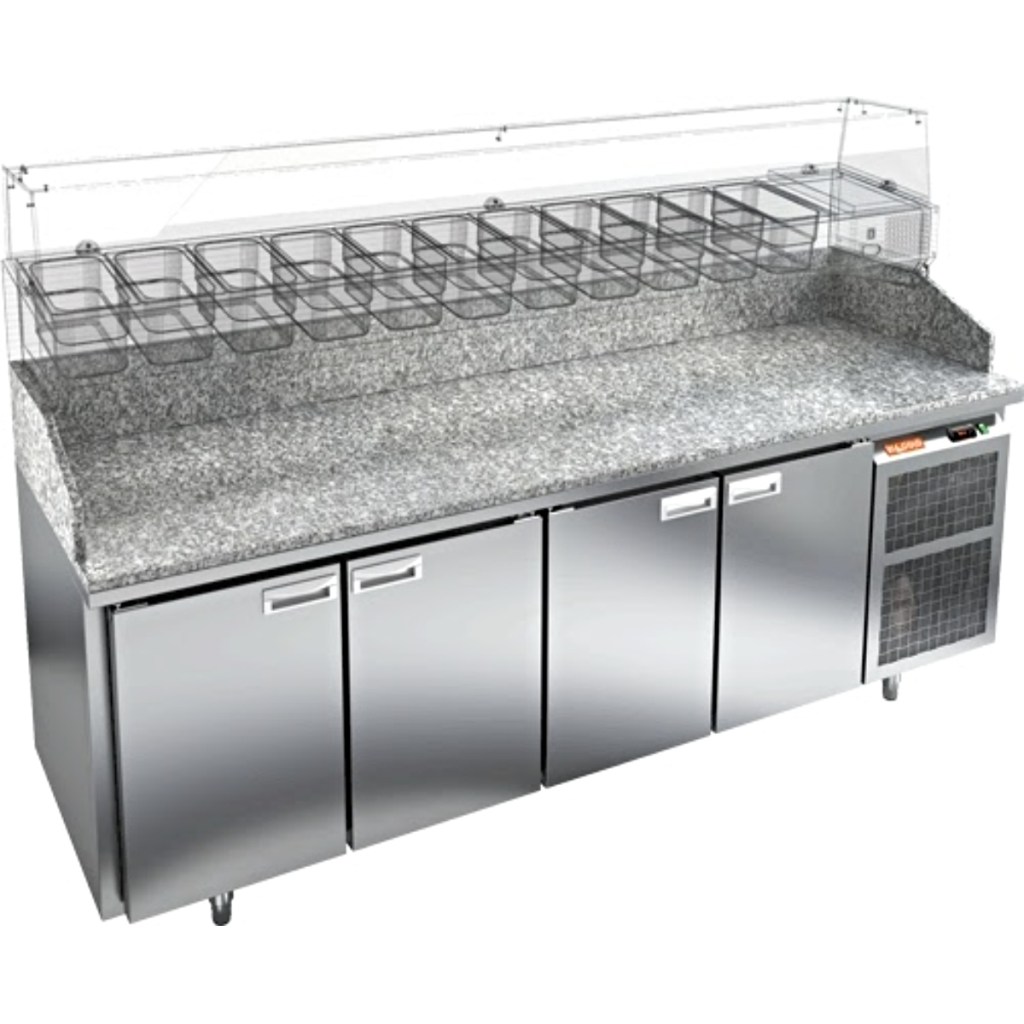 HiCold PZ3-1111/GN М камень — надёжный и вместительный стол для пиццы с гранитной столешницей, идеально подходящий для интенсивной эксплуатации на профессиональной кухне. Поддержка витрин расширяет его функциональность.
