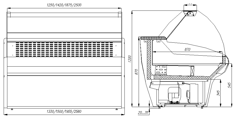 Длина витрины без боковин 1420 мм — компактный размер, удобный для небольших торговых залов.