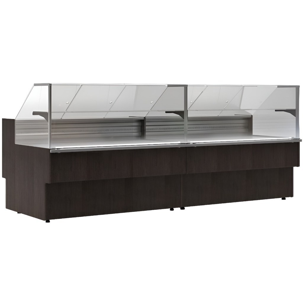 Передняя панель может быть выполнена из окрашенной стали, нержавеющей стали или МДФ. Боковые панели из ламинированного МДФ в стандартную комплектацию не входят и приобретаются отдельно. Для установки в линию нескольких витрин с одинаковым температурным режимом достаточно двух боковин на всю линию.