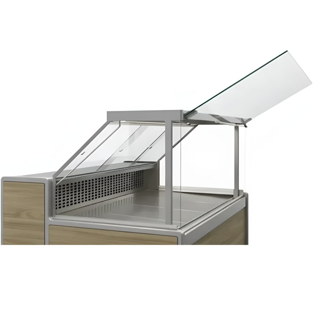 Подъёмное фронтальное стекло с газлифтом — удобный доступ к продуктам и лёгкое обслуживание.