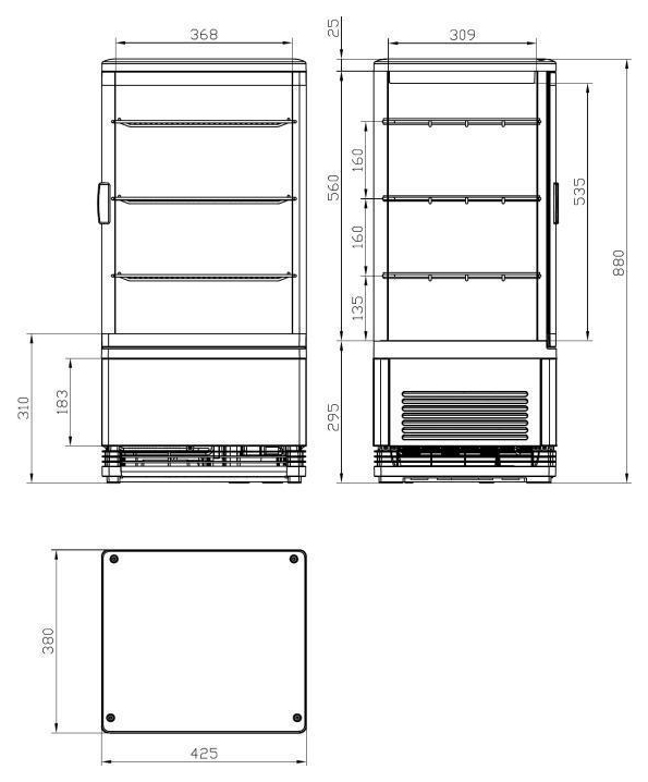 Каталог оборудования Холодильное оборудованиеВитрины настольныеВитрина холодильная настольная Cooleq CW-70 BLACK Витрина холодильная настольная Cooleq CW-70 BLACK Код товара: 065-642 Поделиться: WhatsAppTelegram 0 Цена по запросу Получить консультацию в WhatsApp Описание Характеристики Отзывы 0 Инструкции 3 Витрина холодильная настольная Cooleq CW-70 BLACK предназначена для демонстрации, охлаждения и кратковременного хранения напитков и продуктов на предприятиях общественного питания и торговли. Компактная модель отличается современным дизайном в чёрном цвете, оснащена LED-подсветкой для привлекательной презентации, регулятором температуры и замком для безопасности. Три регулируемые по высоте хромированные полки позволяют удобно организовать внутреннее пространство. Особенности: Динамическое охлаждение для равномерного распределения температуры. Закрываемая на ключ дверь. Хладагент: R600a, количество — 40 г. Климатический класс: 4. Размер полок: 365×307 мм, регулировка по высоте. LED-подсветка для улучшенной демонстрации продукции. Цвет корпуса: чёрный. Cooleq CW-70 BLACK — это стильная и функциональная холодильная витрина, которая сочетает компактность, удобство эксплуатации и современный дизайн, делая продукцию более привлекательной для покупателей.Изображение товара, представленного на фото, может отличаться от его фактического вида. Показать все Габаритные размеры428×386×885 ммДиапазон рабочей температурыот +0 до +12 °CДлина428 ммГлубина386 ммВысота885 ммРазмещениеВертикальная Полезный объем витрины0,068 м³Тип охлажденияДинамическое Климатический класс4 ХладагентR134a Номинальная потребляемая мощность0,18 Напряжение220 ВТип оттайкиАвтоматическая Количество полок3 штГабариты в упаковке475×447×986 ммВес нетто32 кгВес брутто35 кгБрендCooleqВсе витрины холодильные настольные CooleqВсе холодильные настольные витриныВсе витрины настольные для выпечкиВсе настольные витрины для десертовВсе стеклянные настольные витриныВсе вертикальные настольные витрины Оставить отзыв Еще никто не оставил отзыв на этот товар Инструкция на Cooleq CW-70 BLACK.pdfСхема Cooleq CW-70.jpgДекларация о соответствии.pdf Похожие товары Перейти в каталог В наличии 70 625 ₽ Витрина холодильная настольная HURAKAN HKN-UPD100 Под заказ 84 096 ₽ Витрина холодильная настольная HURAKAN HKN-UPD108 В наличии 35 441 ₽ Витрина холодильная настольная HURAKAN HKN-UPD58 В наличии 57 142 ₽ Витрина холодильная настольная TEFCOLD UPD80 BLACK черная С этим товаром покупают В наличии 103 417 ₽ Шкаф холодильный МХМ Капри 0,7М Ранее просмотрено В наличии Цена по запросу Витрина холодильная настольная Cooleq CW-120S В наличии Цена по запросу Витрина холодильная настольная Cooleq CW-160S В наличии Цена по запросу Витрина холодильная настольная Cooleq CW-85 BLACK В наличии Цена по запросу Витрина холодильная настольная Cooleq CW 58 BLACK
